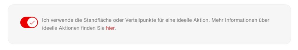 Ideelle Aktionen / Promotionen sind die selben Produkte, die hier zu finden sind und zu der Merkliste hinzugefügt werden können. Wenn die Anfrage auf der Seite Merkliste abgeschlossen wird, kann folgende Option aktiviert werden, um die Anfrage als eine ideelle Aktion zu markieren. Dementsprechend passt sich der Preis an: